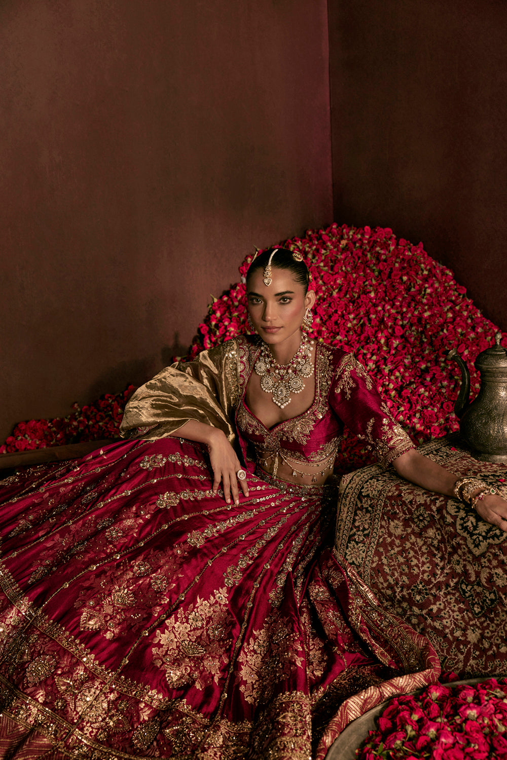Rich silk brocade lehenga highlighted with sequins and zardosi hand embroidery, paired with a raw silk blouse and a tissue dupatta.